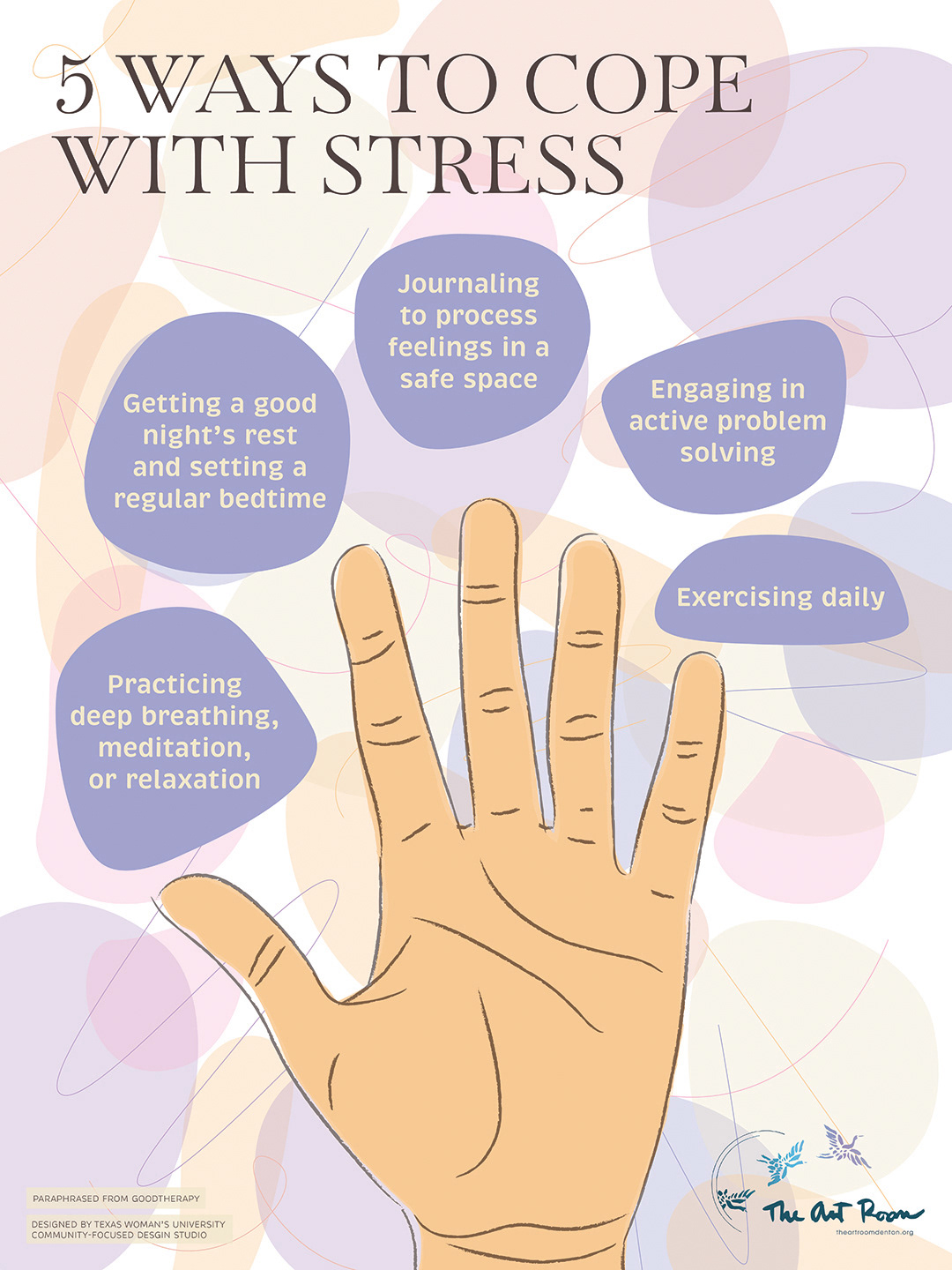 This project was a collaboration with my Community-Focused Design Studio class, with the class dividing up into smaller teams to tackle different aspects of the project. Our client was The Art Room, a business in Denton, TX that promotes "the creative process has therapeutic value in reducing stress, in promoting self-discovery, and in providing a positive means for emotional expression" (excerpt taken from their website). Our client wanted us to design posters that could be displayed in their new art space, as well as promotional flyers and volunteer info. My team was focused on creating posters; after our initial client meeting, we decided to create a series of five posters that provided mental health tips or art/design tips. Since our team was on the larger side, we further broke up into groups of two to tackle one poster each. With my partner Emerald Wilson, we chose to design our poster about coping with stress. Emerald did the research on healthy coping mechanisms, and I took this info to make a simplistic poster that provided the information in a quick, easy-to-digest manner. The idea of "five things so simple, you could count them on one hand" influenced the main subject of this poster, and organic shapes along with a pastel color palette help enhance the feeling of calm.